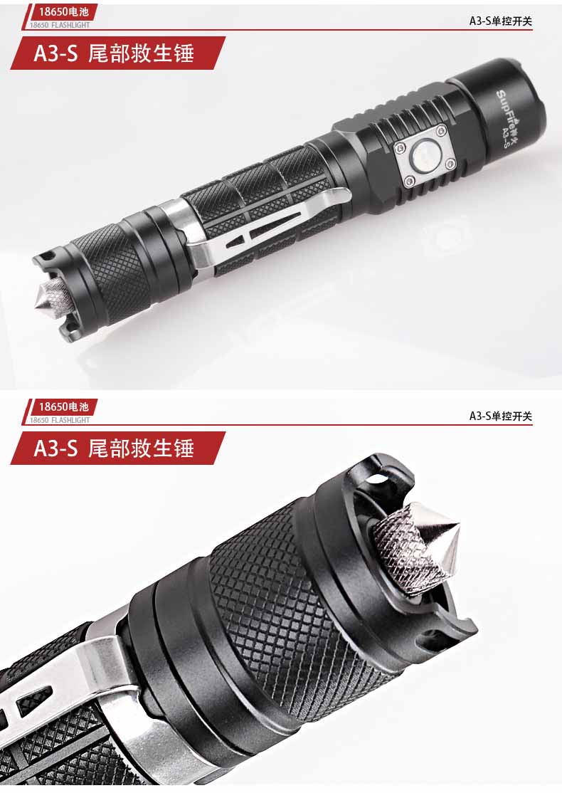 Supfire神火A3-S强光手电筒可充电式LED小超亮远射迷你家用救生锤